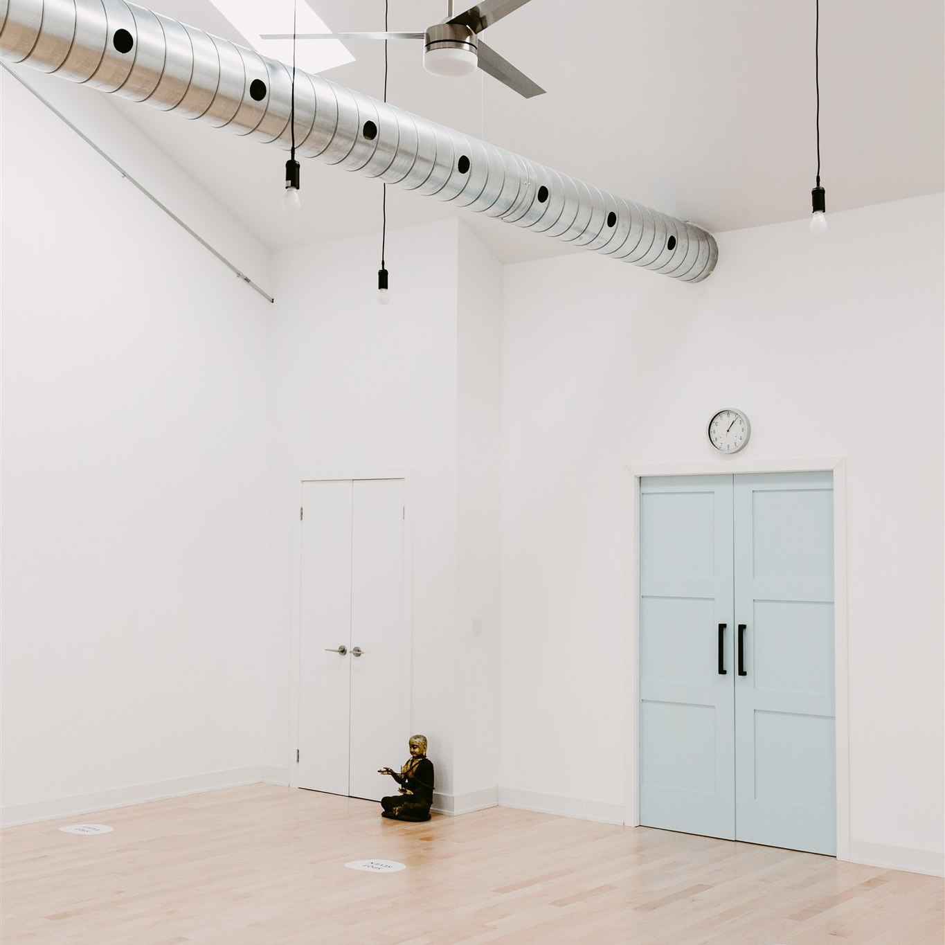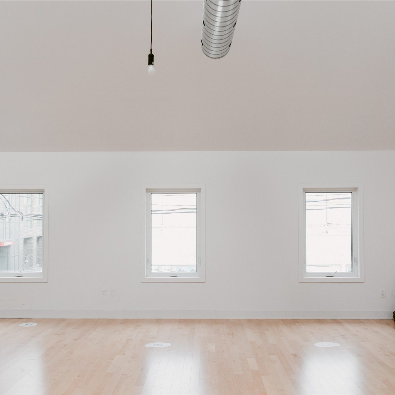 Our second-floor square studio features natural light from skylights and three big windows that also offers extra ventilation. This room is approximately 560 square feet and features oak hardwood floors and dimmable lights.